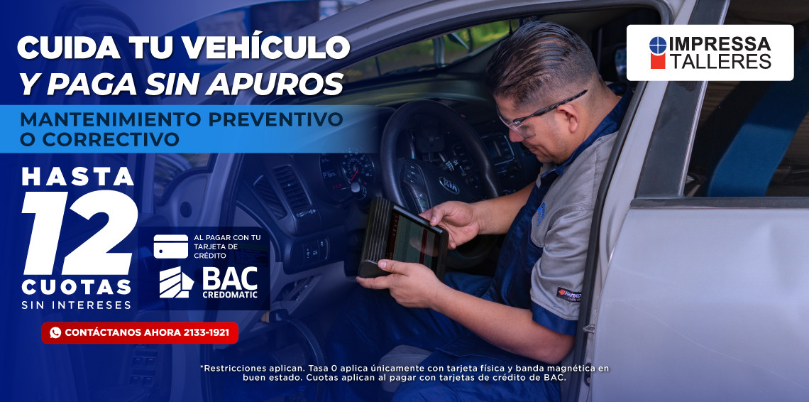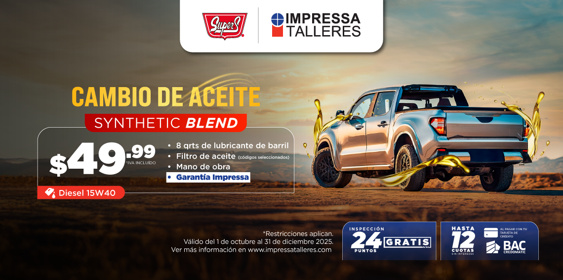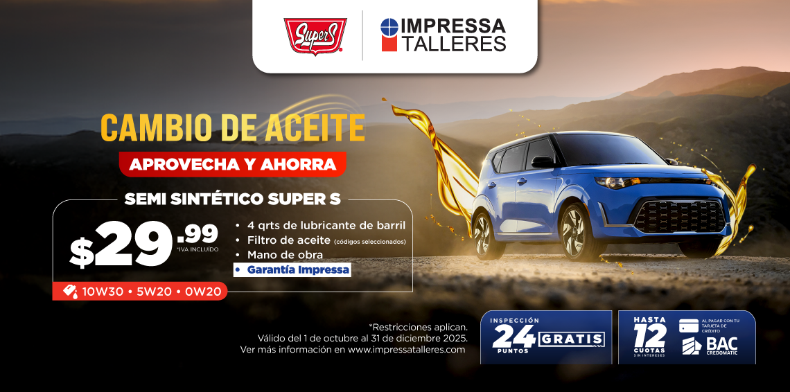*Restricciones aplican. Promoción válida del 1 de octubre al 31 de diciembre 2025. Válida con cualquier forma de pago. Cambio de aceite incluye: 4 cuartos de aceite Synthetic Blend Super S barril, viscosidades 5w20/10w30/20w50, Filtro de aceite (Códigos que aplican: L266, TYFAC0002, CHVFAC0001, L4, L365, CHVFAC0002, L147 ), Mano de obra e Inspección de 24 puntos. No aplica combinada con otras promociones. Aceite 0w20 disponible únicamente en talleres Santa Elena y Merliot. Precio con IVA Incluido. Aplican hasta 12 cuotas con BAC. Precio puede variar según tipo marca, modelo y año del vehículo, o tipo de filtro a utilizar. Si el vehículo utiliza más lubricante o un código de filtro diferente a los que aplica el combo y se genera una diferencia, que será cancelado por el cliente.