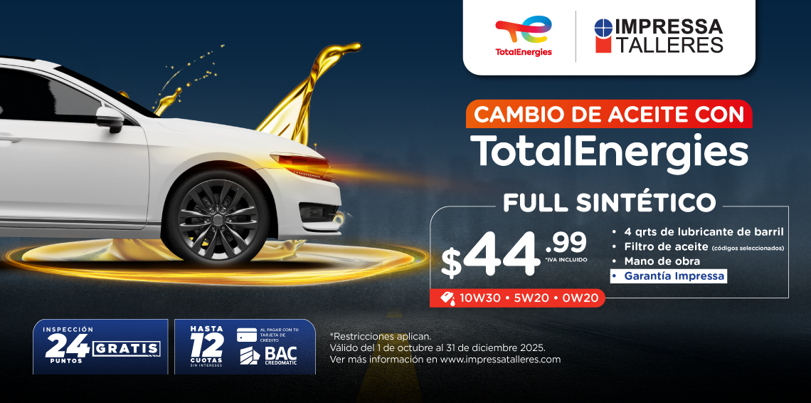 *Restricciones aplican. Promoción válida del 1 de octubre al 31 de diciembre 2025. Válida con cualquier forma de pago. Cambio de aceite incluye: 4 cuartos de aceite de barril Total energies, viscosidades 5w20/10w30/0w20 Full sintético, Filtro de aceite (Códigos que aplican: L266, TYFAC0002, CHVFAC0001, L4, L365, CHVFAC0002, L147), Mano de obra e Inspección de 24 puntos. No aplica combinada con otras promociones. Aceite 0w20 disponible únicamente en talleres Santa Elena y Merliot. Precio con IVA Incluido. Aplican hasta 12 cuotas con BAC. Precio puede variar según tipo marca, modelo y año del vehículo, o tipo de filtro a utilizar. Si el vehículo utiliza más lubricante o un código de filtro diferente a los que aplica el combo y se genera una diferencia, que será cancelado por el cliente.