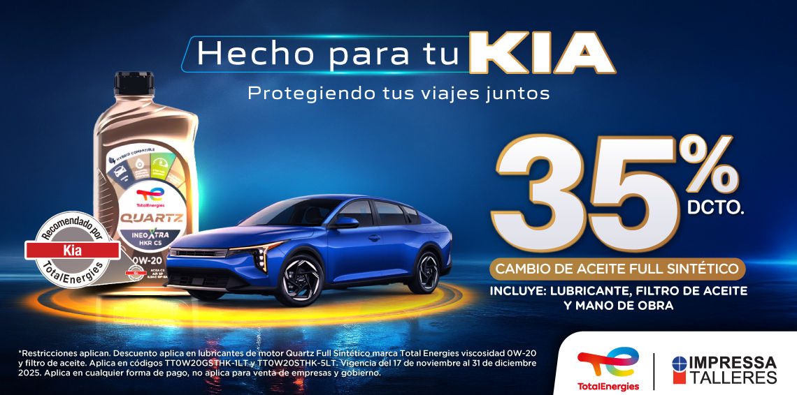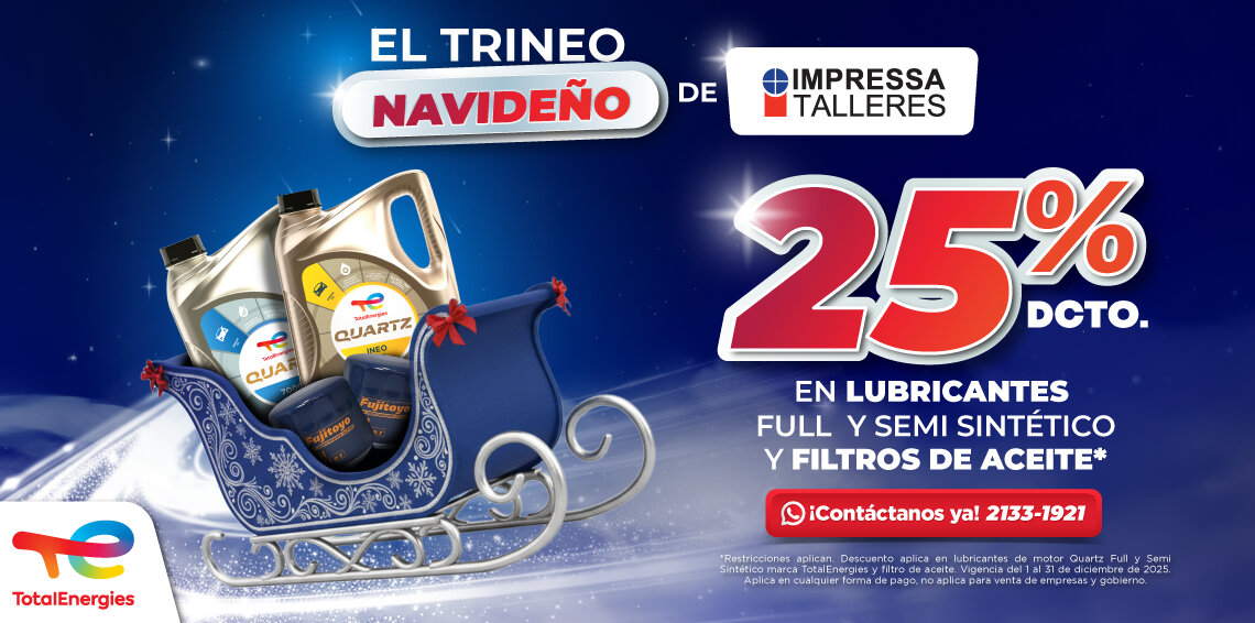 *Restricciones aplican. Descuento aplican en lubricantes de motor Quartz Full y Semi Sintético marca Totalenergies y filtro de aceite. Vigencia del 1 al 31 de diciembre de 2025. Aplica en cualquier forma de pago, no aplica para venta de empresas y gobierno.