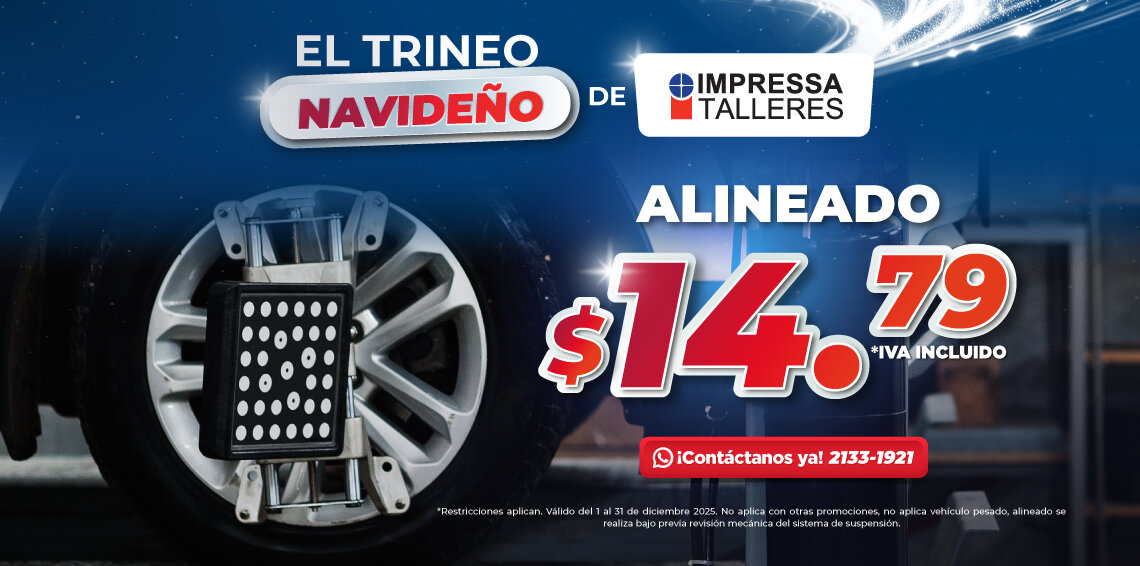 *Restricciones aplican. Válido del 1 al 31 de diciembre 2025. Precio con IVA incluido. No aplica con otras promociones, no aplica vehículo pesado, alineado se realiza bajo previa revisión mecánica del sistema de suspensión.