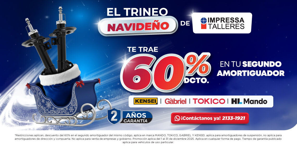 *Restricciones aplican, descuento del 60% en el segundo amortiguador del mismo código, aplica en marca MANDO, TOKICO, GABRIEL Y KENSEI. aplica para amortiguadores de suspensión, no aplica para amortiguadores de dirección y compuerta. No aplica para venta de empresas y gobierno. Promoción aplica del 1 al 31 de diciembre 2025. Aplica en cualquier forma de pago. Tiempo de garantía publicado aplica para vehículos de uso particular. Para más detalle de la garantía visita www.impressarepuestos.com