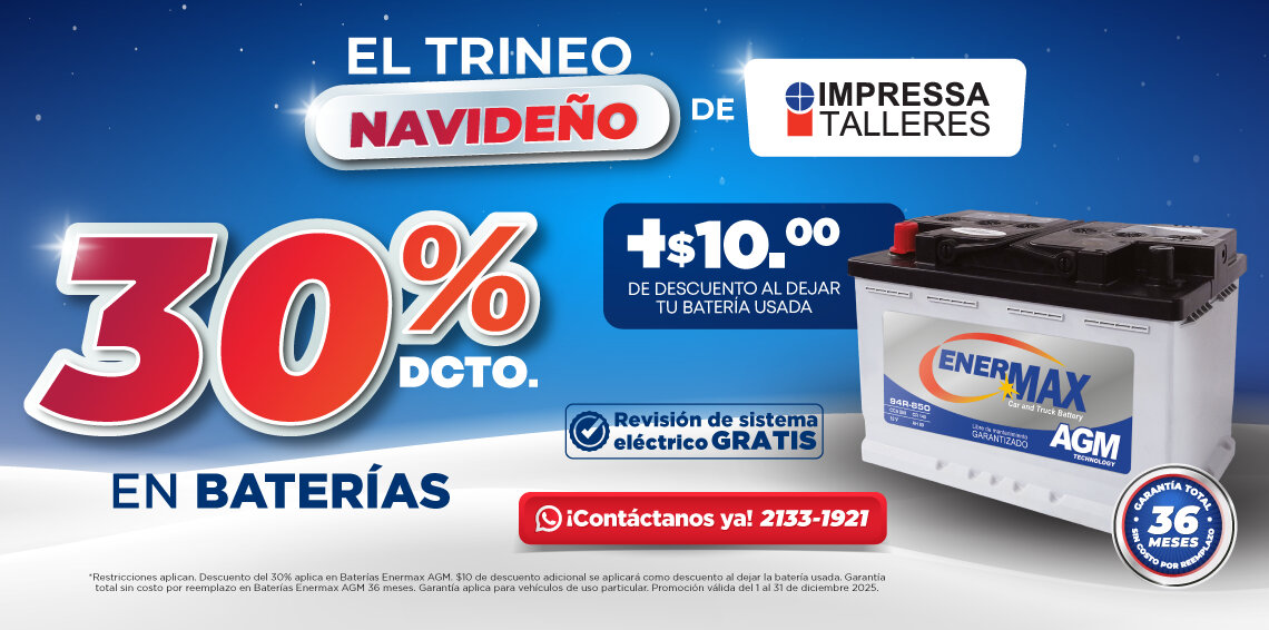 Restricciones aplican. Descuento del 30% aplica en Baterías Enermax AGM. $10 de descuento adicional se aplicará como descuento al dejar la batería usada. Garantía total sin costo por reemplazo Baterías Enermax AGM 36 meses. Garantía aplica para vehículos de uso particular.  Promoción válida del 1 al 31 diciembre 2025.