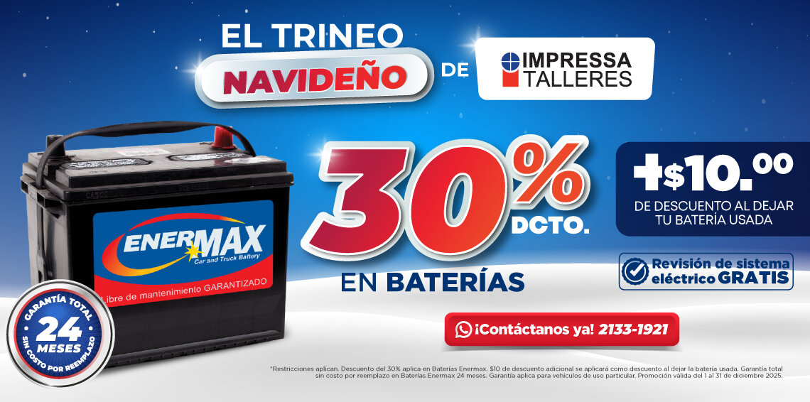 Restricciones aplican. Descuento del 30% aplica en Baterías Enermax estándar  $10 de descuento adicional se aplicará como descuento al dejar la batería usada. Garantía total sin costo por reemplazo en Baterías Enermax 24 meses. Garantía aplica para vehículos de uso particular. Promoción válida del 1 al 31 diciembre 2025.