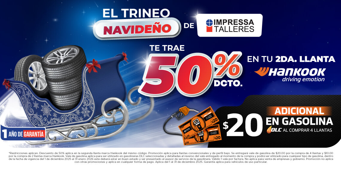 *Restricciones aplican. Descuentos de 50% aplica en la segunda llanta marca Hankook del mismo código. Promoción aplica para llantas convencionales y de perfil bajo. Se entregará vale de gasolina de $20.00 por la compra de 4 llantas y $10.00 por la compra de 2 llantas marca Hankook. Vale de gasolina aplica para ser utilizado en gasolineras DLC seleccionadas y detalladas al reverso del vale entregado al momento de la compra y podrá ser utilizado para cualquier tipo de gasolina, dentro de la fecha de vigencia del 1 de diciembre 2025 al 31 enero 2026 este deberá estar en buen estado y ser presentado al asesor de servicio de la gasolinera. Válido 1 vale por factura. No aplica para venta de empresas y gobierno. Promoción no aplica con otras promociones y aplica en cualquier forma de pago. Aplica del 1 al 31 de diciembre 2025. Garantía aplica para vehículos de uso particular.