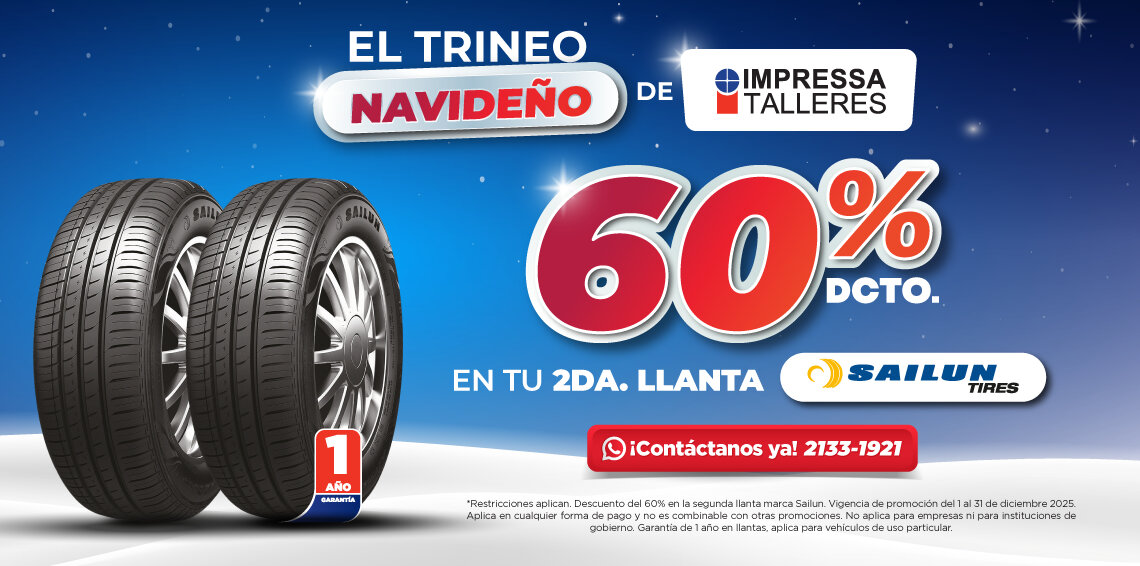*Descuento del 60% en la segunda llanta marca Sailun. Vigencia de promocion del  1 al 31 de diciembre 2025. aplica en cualquier forma de pago y no es combinable con otras promociones. No aplica para empresas, ni para instituciones de gobierno. Garantía de 1 año en llantas aplica para vehículos de uso particular.